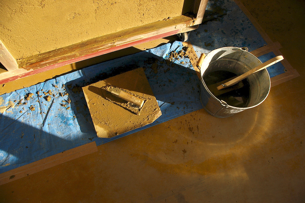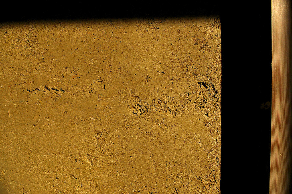 後半で多少は要領は得たものの、諦めて一塗りずつ土をコテに載せ、壁に塗り始めました。。。というか、ほとんど押し付けるような状態。再び、コレがまず出来ない、学院長さんの言葉がかすめて行きます。まったく思う様に行きません。何気に塗り伸ばしていたように見えていた実演では、厚み3ミリぐらいですかね〜。だった筈が1センチぐらいモッコリしてしまうやら、塗りのこって下地が見えたままやら。壁際に至っては、控えめにという話もそれどころでなく、土を押し付けてしまう始末。新築の家でこんな事をしたら間違いなくお払い箱です。予想以上に悪銭苦闘。窓際にいたものだから、背中の陽がだんだんと暑く。汗やら冷や汗やら。