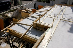 1階床版と地階壁のコンクリート打設が無事終了しました。写真は連続した玄関庇とバルコニーの部分。