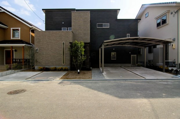 この住宅はデベロッパーから注文住宅の設計依頼で計画したものです。大阪の近郊都市で大規模に開発の進む新興住宅地の中にあります。地区計画で外壁等の色の制限がある中、周囲の住宅のほとんどは淡いトーンで彩られていますが、施主さんの意向もあり、条例許容範囲ギリギリ?のグレートーンの外観に計画しています。周囲から見れば一棟異彩をはなっているかもしれません。