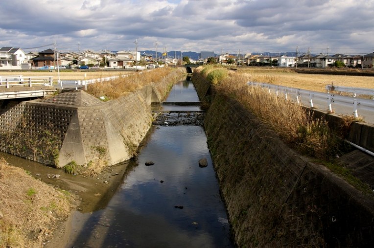 その当時の住まいの近く関西本線(現・大和路線)の北側に平行して走る小川があります。この小川に、小学生のころランドセルを流してしまいました。確か新学期になって真新し教科書が詰まっていた筈です。その頃まだ写真のような堤防ではなく、土手になって川まで降りる事も難しくありませんでした。悪ガキだった友達3人と橋のない所をわざわざ渡ろうとしていました。その一人一番体格の良かった友達が、僕のランドセルを向こう岸まで放り投げてくれる筈が。。。ズルズル。ボチャン。。慌てた友達は拾おうとしてくれましたが、意外と流れが早く、流れる僕のランドセルを3人で見送るハメになってしまった訳です。