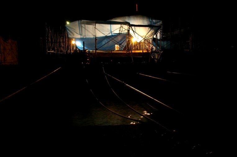 自宅近く、西宮港の入り江でしばらく前からごそごそと大掛かりな工事をやっていた。対岸に大っきなクレーンやらが常駐し、気がつけば海水をせき止め何やってんだろうと気になっていたら、鉄筋が組まれていた。普段はバリケードで囲われて近くに寄れず、いまひとつ様子が分からなかったのだけど、立て看板を見つけ水門を造るのだと分りひとしきり興味津々の毎日です。夜遅く事務所の帰り、普段は真っ暗なのにこの日はブルーシートに囲われて明かりが灯っていた。人気が無かったのでこっそり近づいてみたら、現場の中程にストーブが煌煌と焚かれていた。コンクリートの打設が終わったんだと分る。