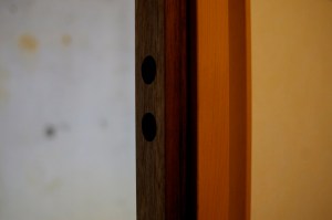 引込み障子の引手にウォルナットを使っています。丸穴二つは引込んだ時の手掛かりになっています。