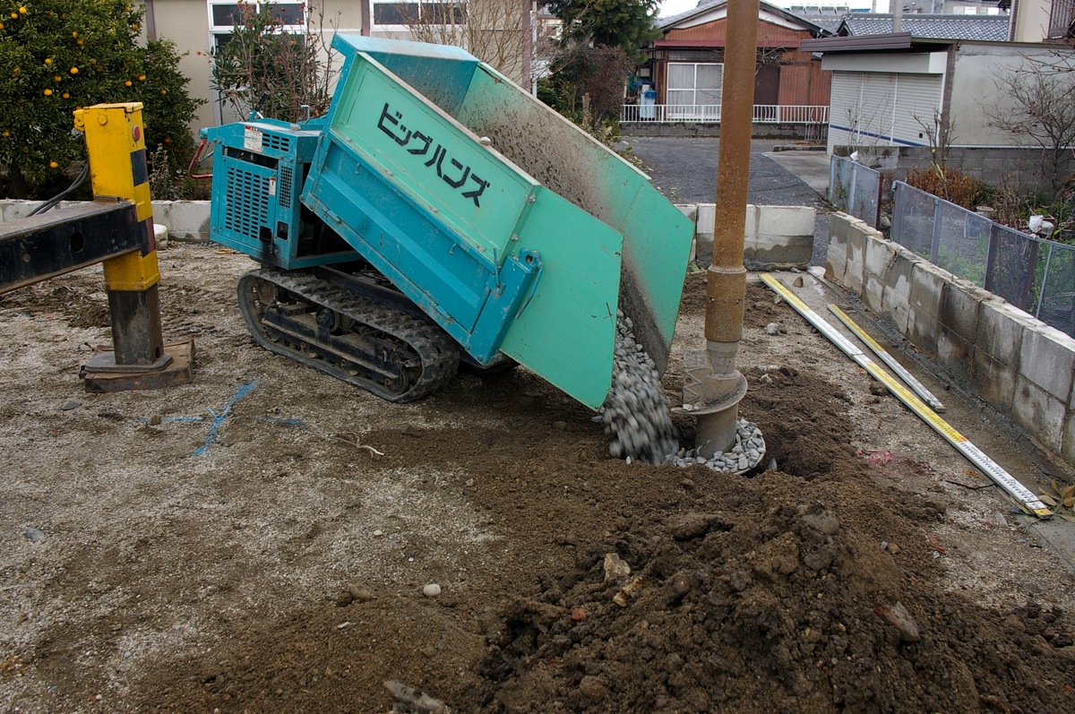 今回は砕石パイルという地盤改良の工法を採用して進めています。 実は工務店さんからの提案で初めて知りました。一般的に住宅に使われる主流の改良工法は、柱状改良と言われるセメントと土を練り混ぜた柱を地面の中にこさえる工法ですが、この砕石パイルではセメントなどを使わず(分かりやすく言えば)砂利を詰め込むだけの工法です。ただ詰め込むと言っても、それなりに開発された認定工法なのでちゃんとした計算の元に進めています。