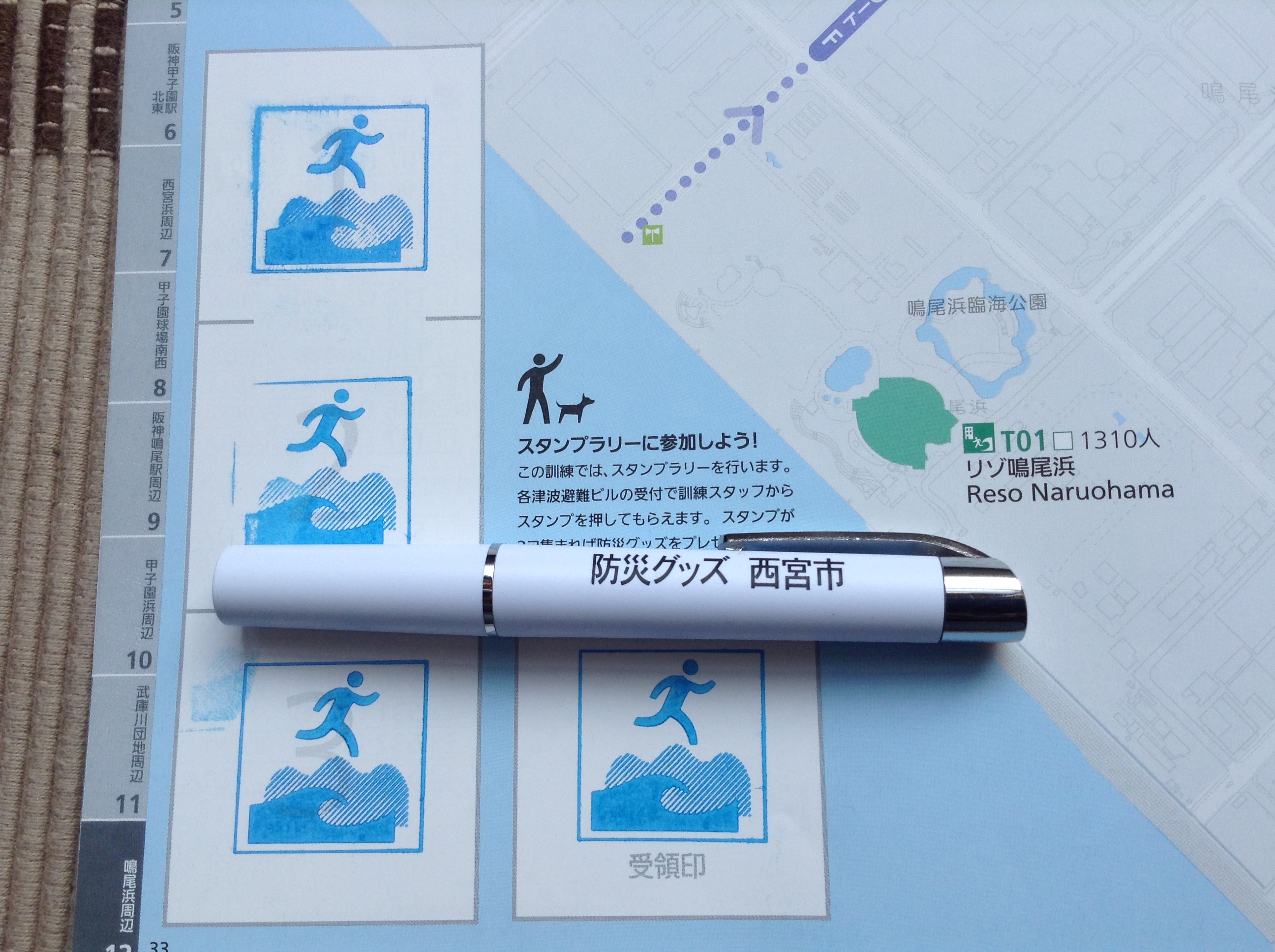 先週末、僕が住んでいる地区を含んだ「にしのみや津波ひなん訓練」が行われました。予め配布されていた小冊子をしっかり見てなかったのが悪く、申込の必要だった「炊き出し」などのイベントを含んだ実地訓練に参加することが出来なかったのが残念。。。それでも自由参加?な避難場所を確認して回るスタンプラリーはせめてと思い、参加してみる事にしました。