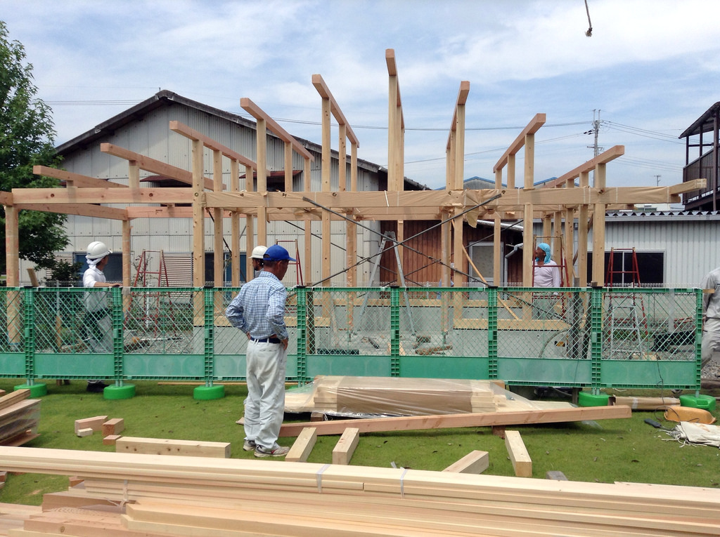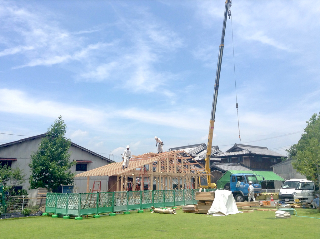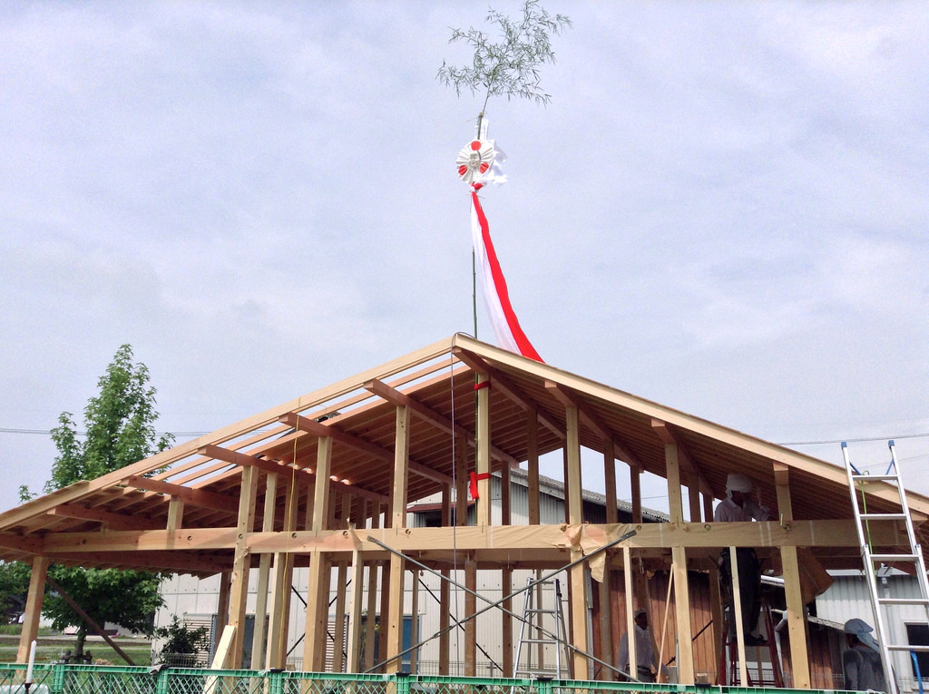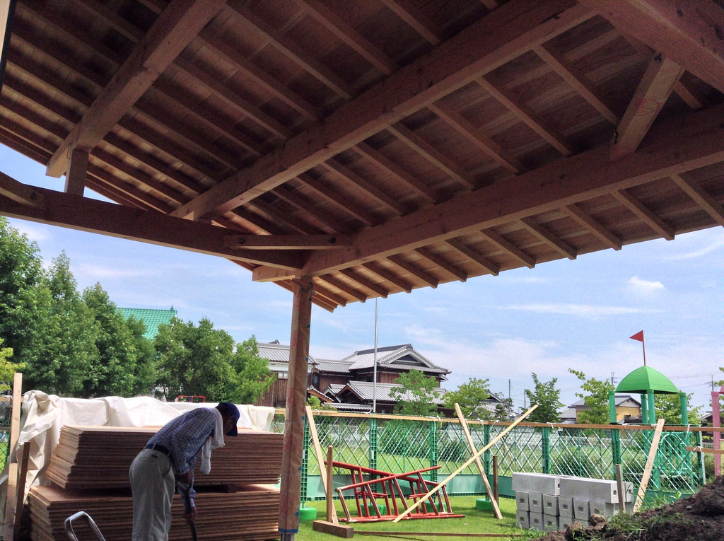 昨日から保育所のちっちゃな倉庫棟の棟上げでした。去年の暮れくらいからボチボチと進み、ようやく棟上げを向かえたところです。つい先日の台風に怯えた日が嘘のように、焦げ付くような強烈な日差し。屋根に上る大工さんはたまらんです。ちっちゃいけど、大屋根の片側は子供達の遊び場になります。夏前に出来ていれば一番良かったのですが、コレばかりは仕方ありません。