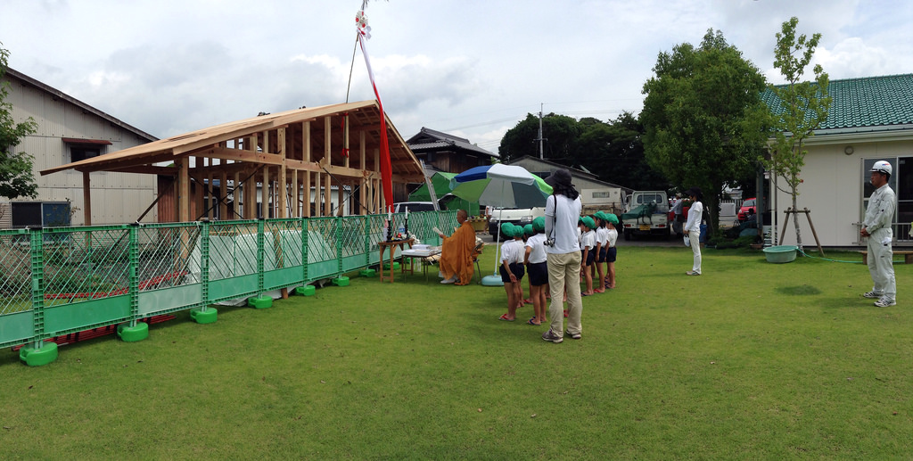 今朝は、年長の子供達が揃って棟上げ式をしました。お坊さん姿が園長先生です。園長先生のお経?をお行儀よくじっと聞いていたのですが、あまりの暑さで建物陰に退散の一場面も。式の後に記念撮影。
