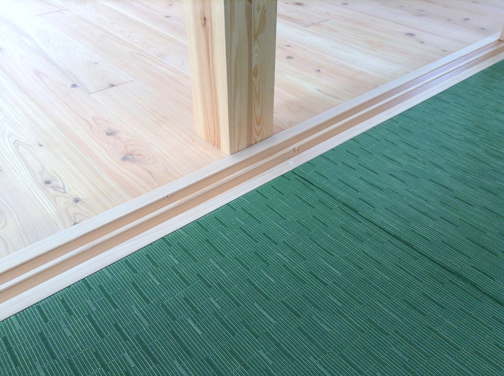 まだ家具の無い広いリビングダイニングの一画に畳が入った。畳と言うより、TATAMIな感じ。監督さんが探して来た一風変わった畳のサンプルを見た時、色とりどりで見た事のない柄の切れ端が面白いと思って採用してみたのだが、いざ敷き込まれた様子を見ると、なんとも不思議な感じがした。化繊で織り込まれた畳は、写真で見るよりもずっと艶っぽい。
