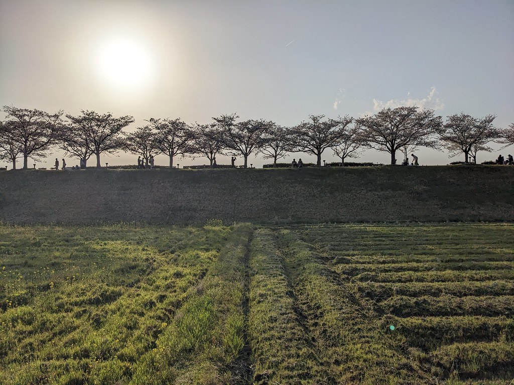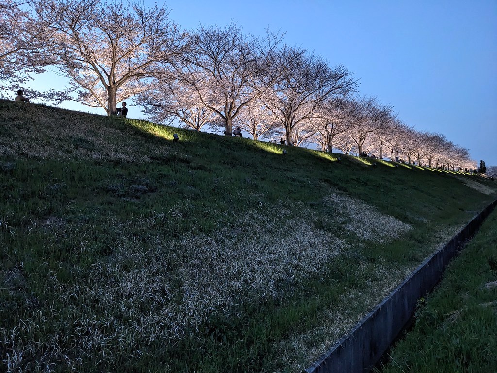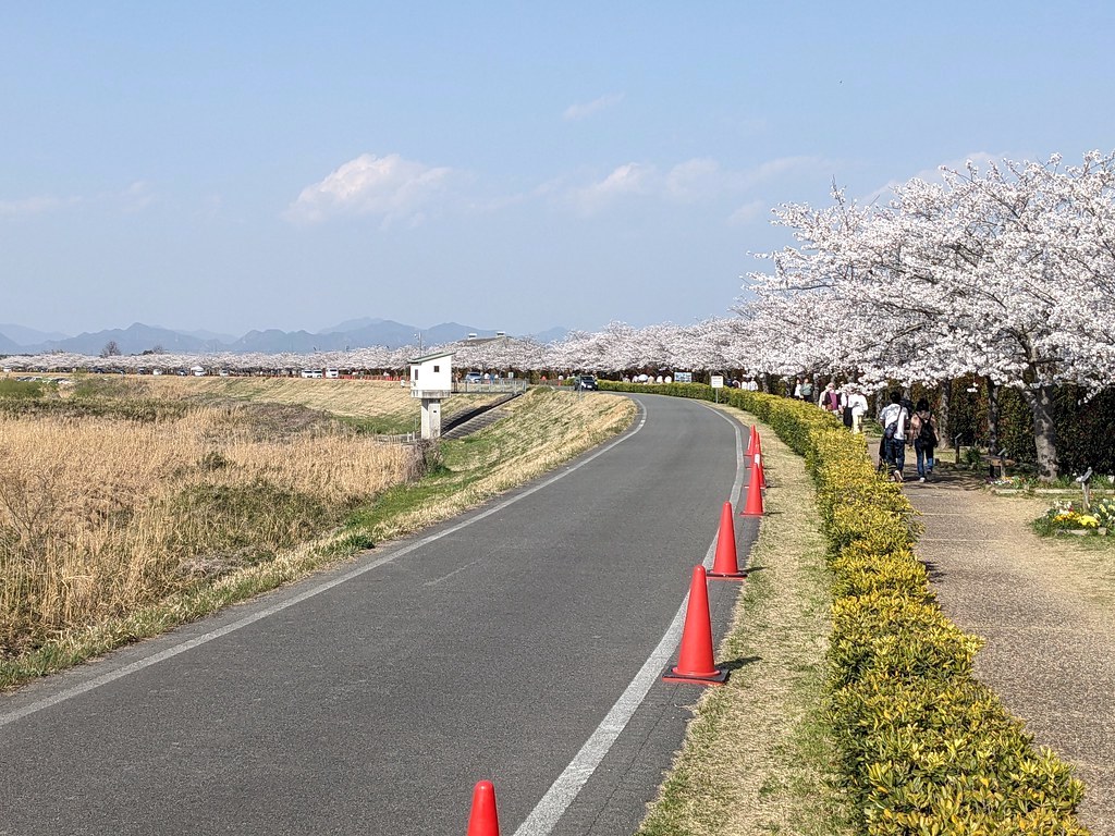 車で近づきはじめれば、河川敷の桜並木が想像をはるかに超えて延々と続いているのが圧巻。廻りはほぼ田園風景です。土手上の小道を歩きはじめれば、桜以外ほとんど視界に入らずに済み。樹の背も低く揃っていることで、やわらかく桜の天蓋に包まれる気分に浸れます。これはなかなかに幻想的です。