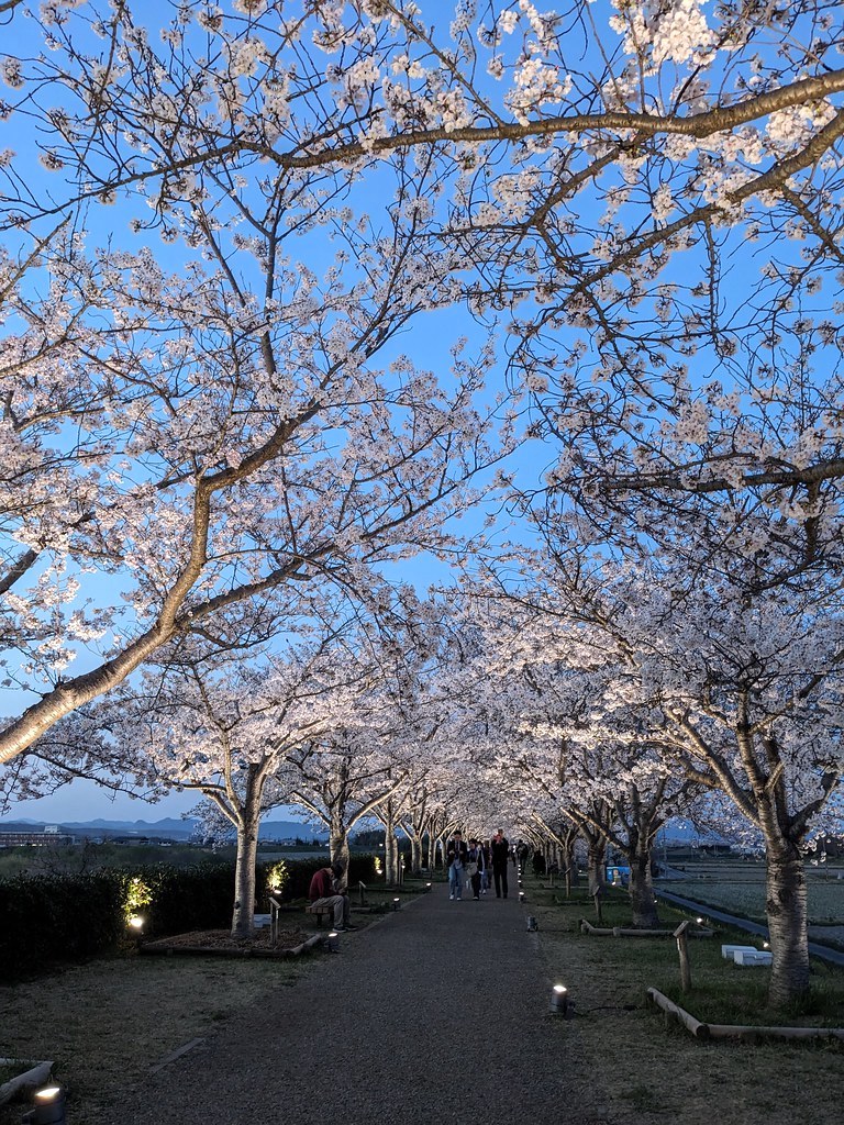 平日で混み合ってもおらずお天気にも恵まれ、爽やかな散歩を楽しめました。往復して戻ってくるころ、ライトアップが始まるのでしばらくして待つことに。暗くなって帰ろうとすれば、行き違いで夜桜を楽しみに人が増えてきました。