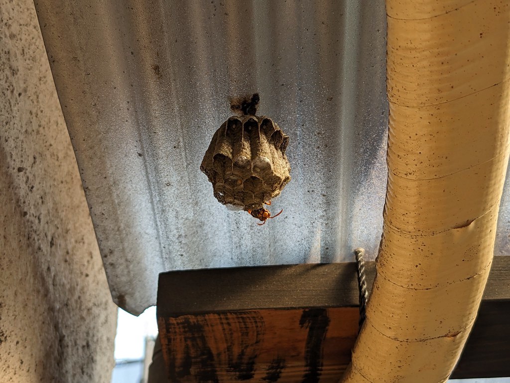 話が逸れますが、夕暮れになって軒下をうまく飛べない蜂がいました。ブンブン飛び立つ度に軒裏に頭をぶつけて、巣に近づけないでいるように見えます。