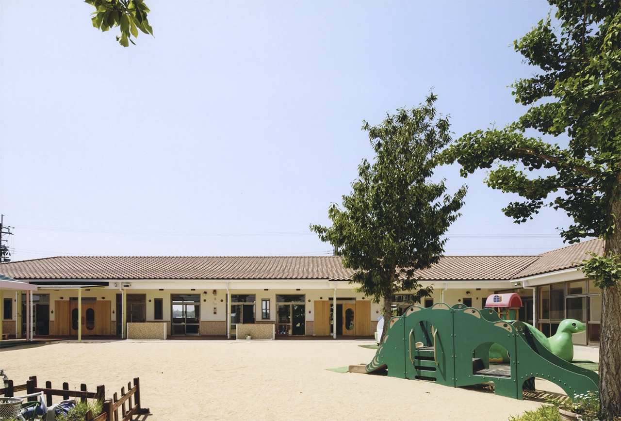この保育所は、田んぼに囲まれた穏やかな風景の中にあります。園の庭には、当初から数本の大きなアメリカフーの木が枝を広げていました。秋には真っ赤に染まります。ゆったりとした生活環境を重視する保育方針は、都会暮らしの身にはなんとも贅沢な感じがするくらいです。この東古瀬保育園で、遊戯室と事務所棟を含む0〜4歳児園舎の建て替えを行いました。