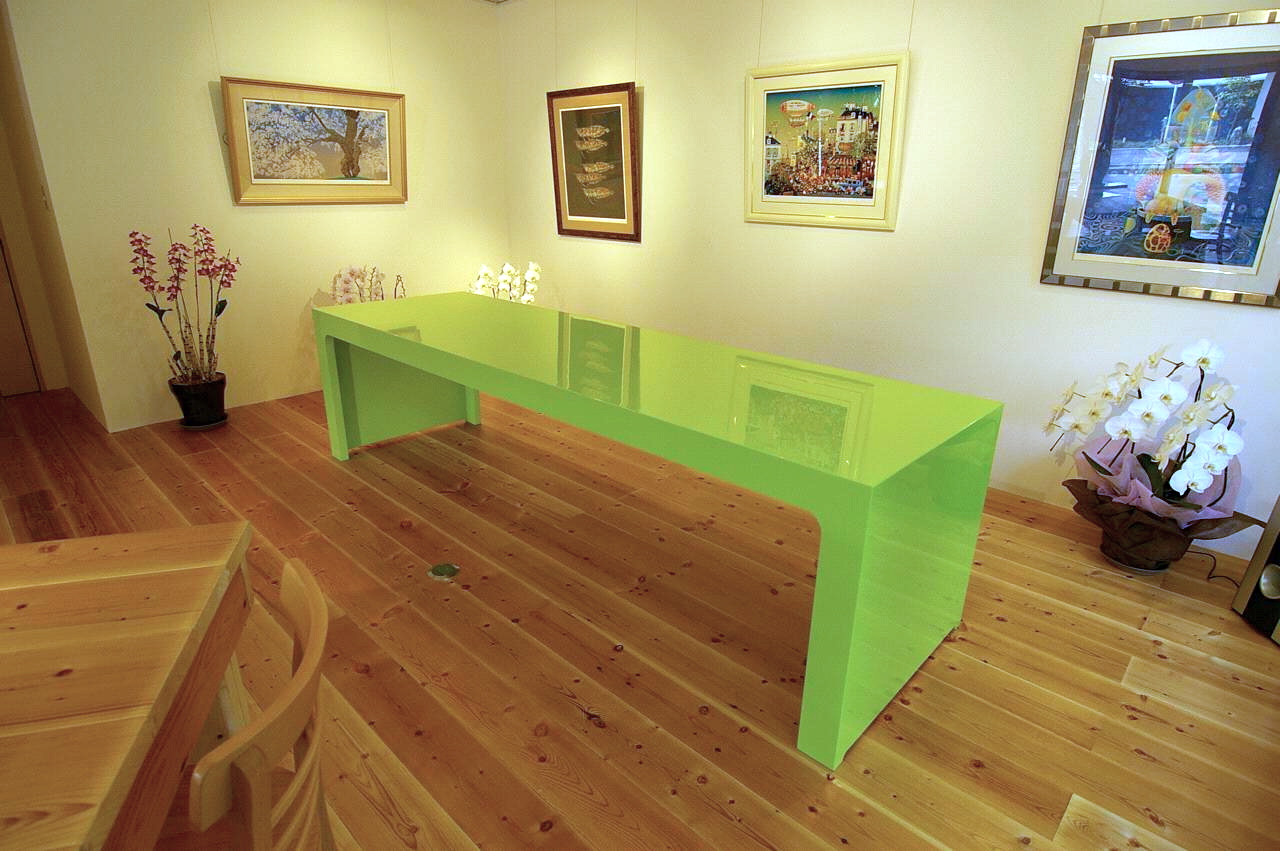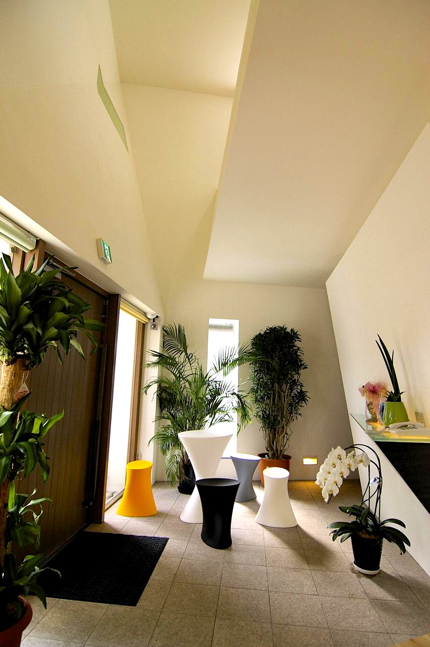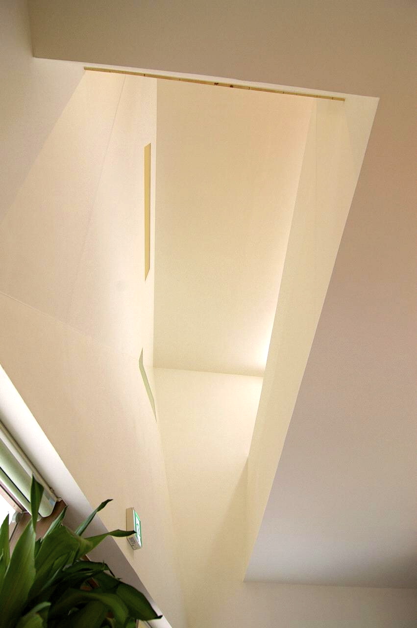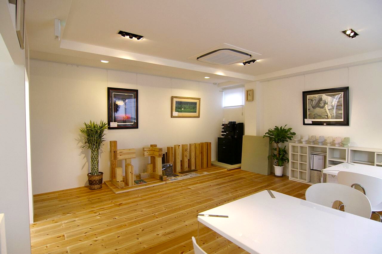 内装は白と自然な木の色が基調の柔らかくもモダンなイメージを演出しています。エントランスホールに入れば傾いた壁や天井が外観からは想像できない量感を演出し、柔らかい光が心地よい吹き抜けになっています。1階は主にギャラリー、ショールームとして使われる多目的なスペースがあり、壁を間をすり抜ける様に2階へ上がると打合せ・商談スペース、そして事務所スペースがあります。3階には会議室等があります。