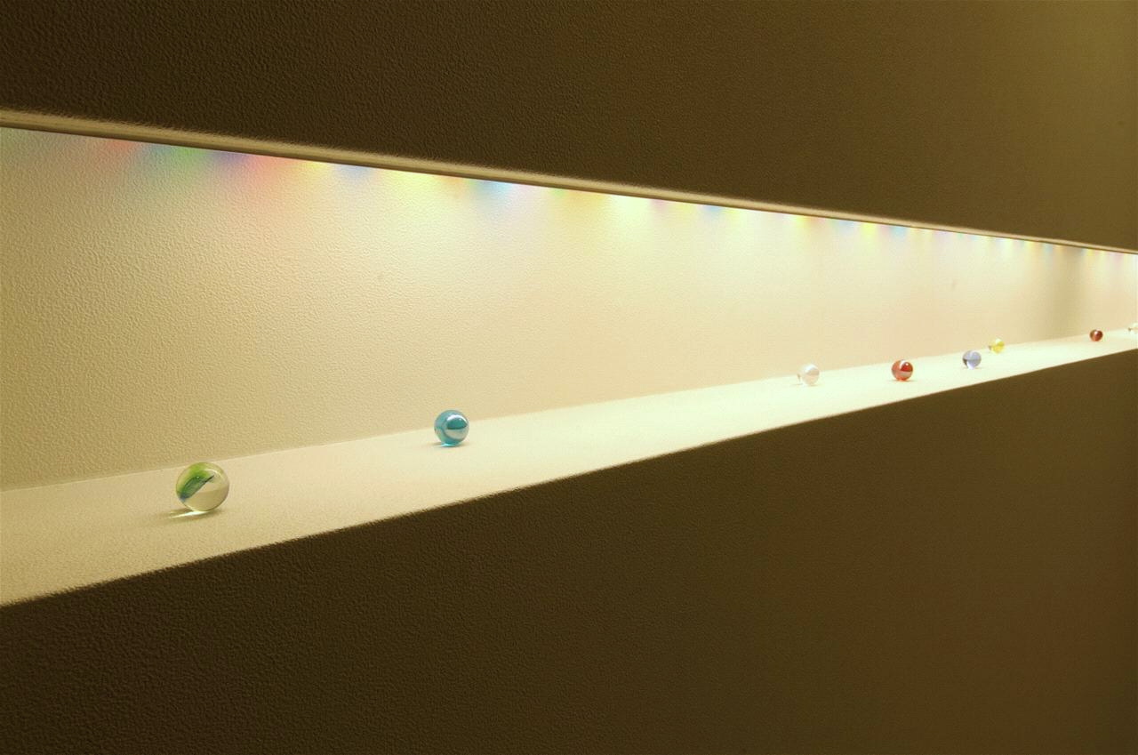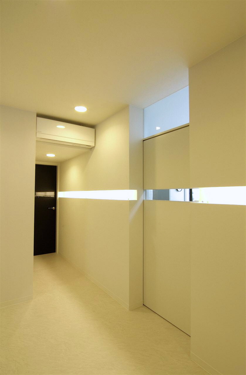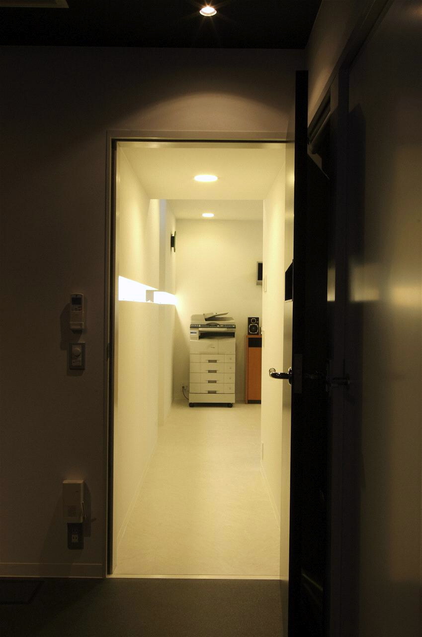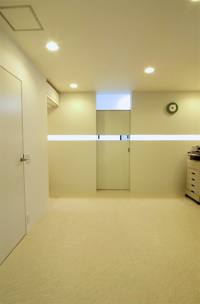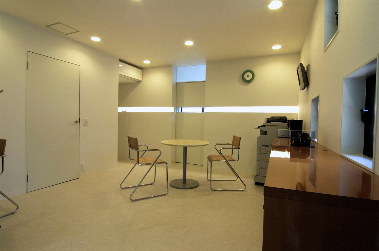 ですが一歩玄関に入ると、予想を裏切るように一面に真っ白い応接スペースが目に入ります。映像制作の打合せや、制作中スタッフの待機スペースとなっています。また、必要に応じて映像素材の撮影も行われます。奥の壁で光の帯の様に見えるのは横長スリット状のニッチですが、照明を仕込み映像事務所らしく試験電波の映像をイメージした光の帯をほんのりと演出しました。帯の裏の部屋は事務スペースになっています。