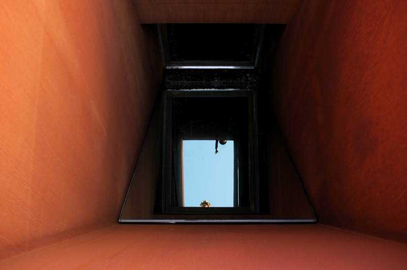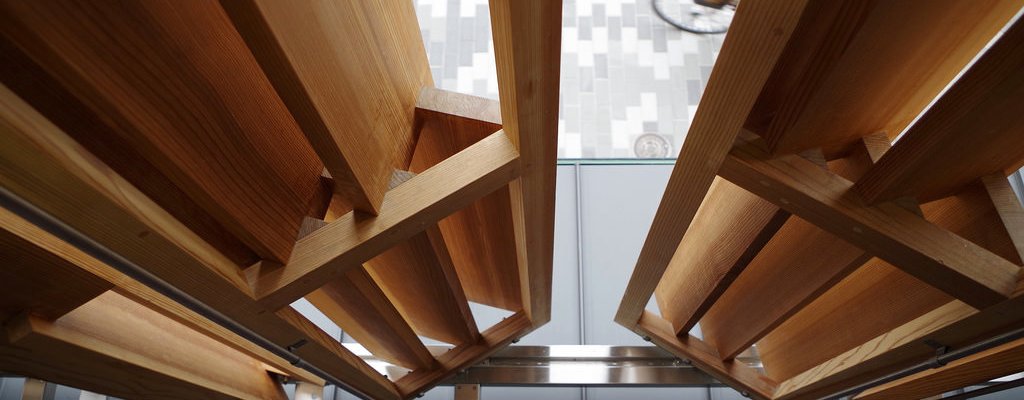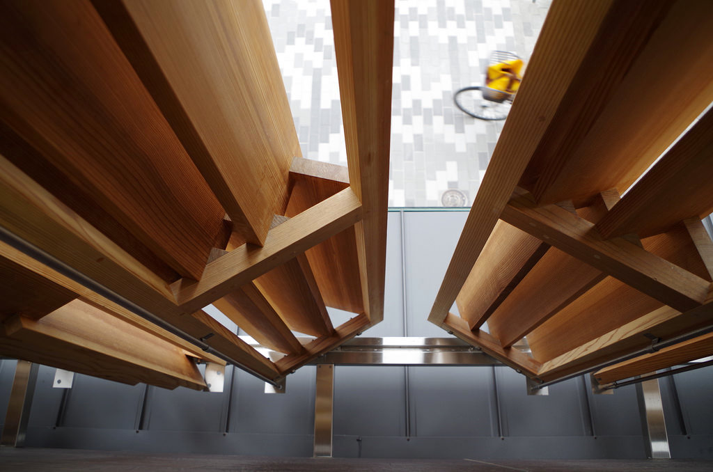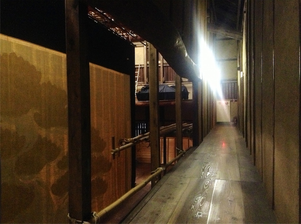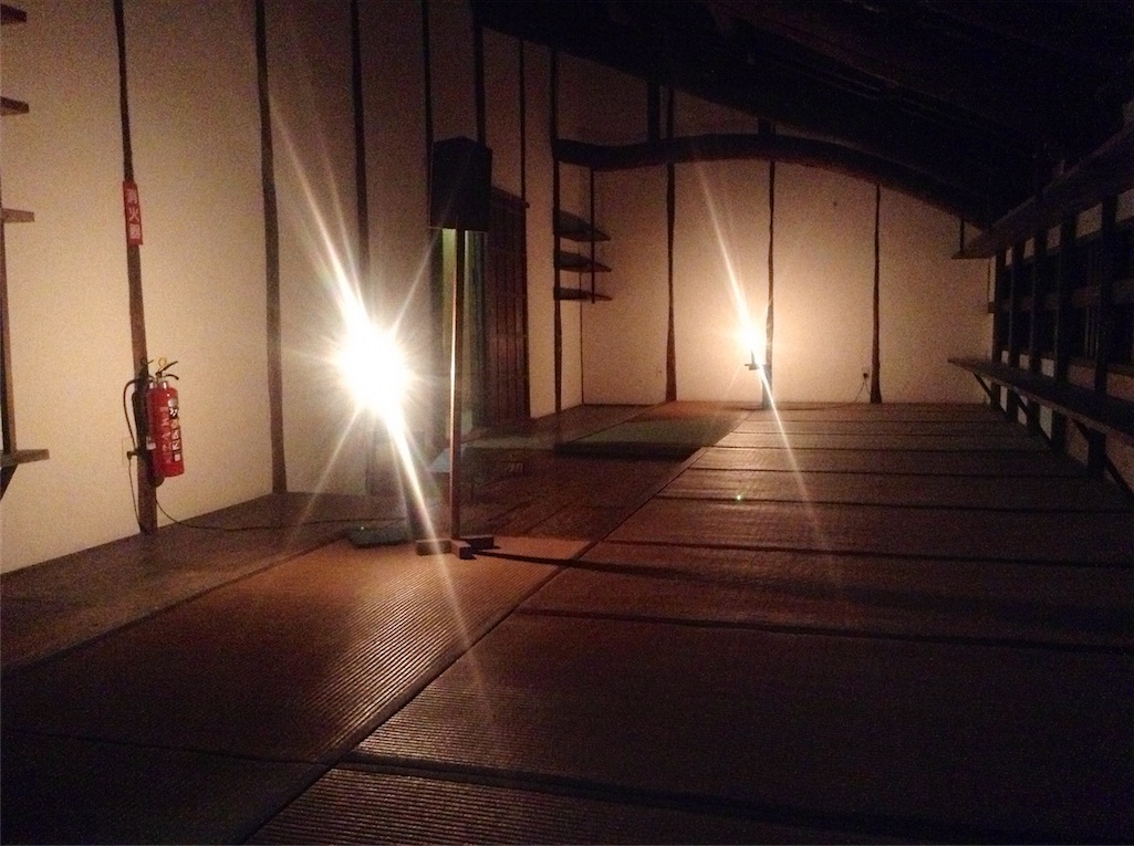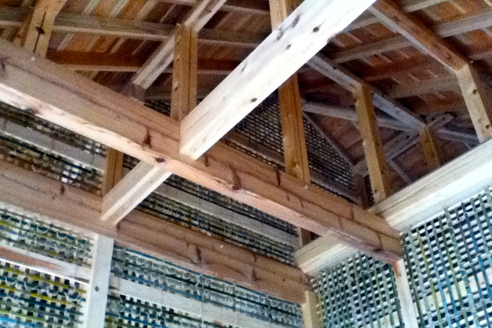 壁や天井の板張りのように見えるところは、実はすべて105ミリ角の柱材。誤射などの際、コンクリート壁のままだと跳ね返りで被弾の恐れがあるため、100ミリ以上の木材を張るのが規定にあるのだそう。