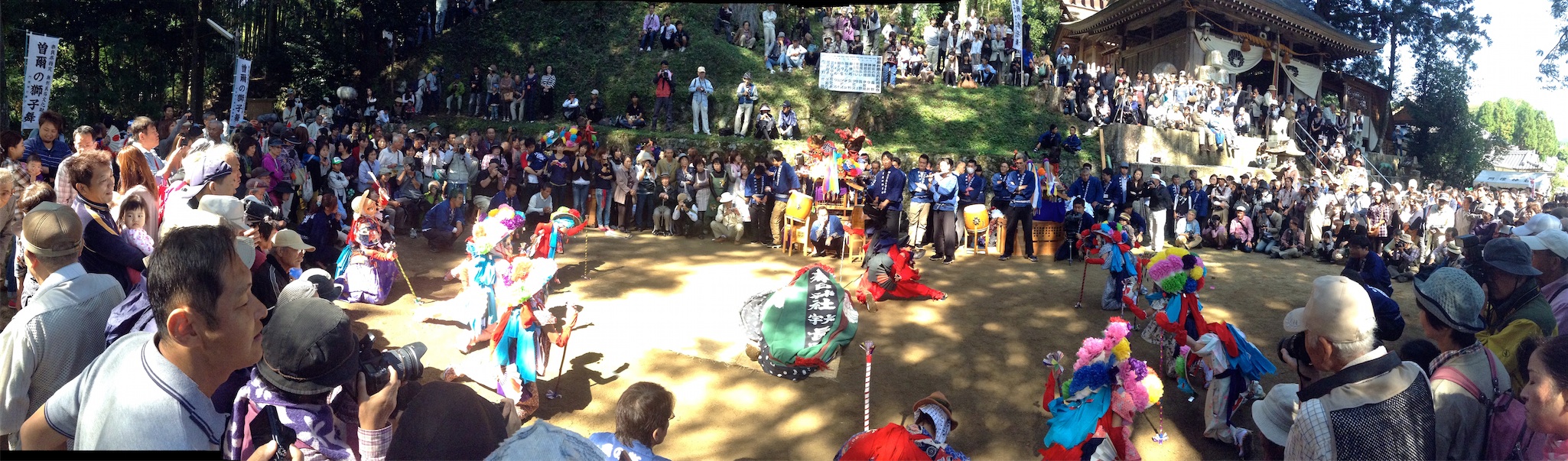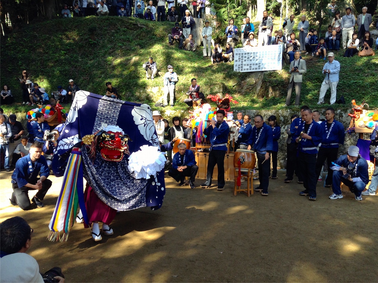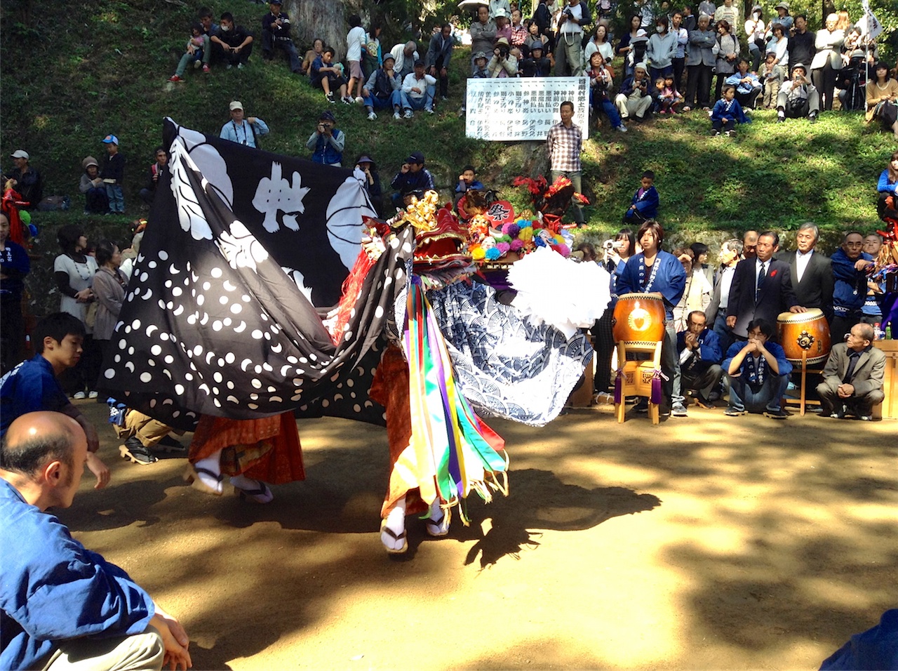 獅子舞と言うと、正直なところ祭りの添え物的なイメージがありました。ですが、後半の演目を拝見しただけでも舞の表現の豊かさに驚きます。そして、獅子舞を守り、受け継ぐ地元の大人と子供、それを応援し暖かく見守っている村の人々。鎮守の森に囲まれた境内の中で、さわやかな一体感がなによりも印象的でした。
