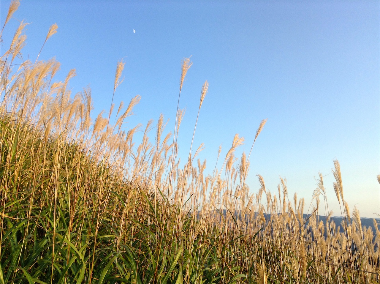 獅子舞はお昼に終わり、当初目的の曽爾高原に向かいました。休日かつ快晴、観光客が一杯です。高原に着く少し手前の休憩所に車を停めて食事。そこから30分程の自然道を歩いて、パノラマに拡がるススキの原っぱに到着しました。