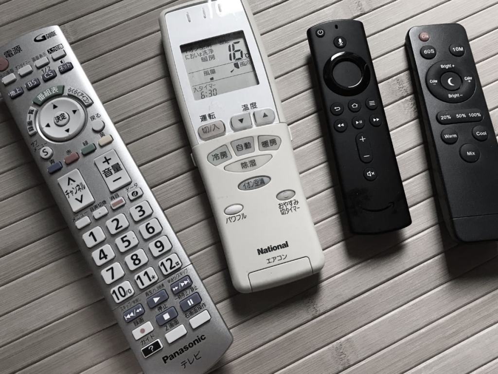 わが家の自宅リビングにある常駐リモコンは4つ。テレビに、エアコンに、照明。さらにAxxzonのスティックリモコン。