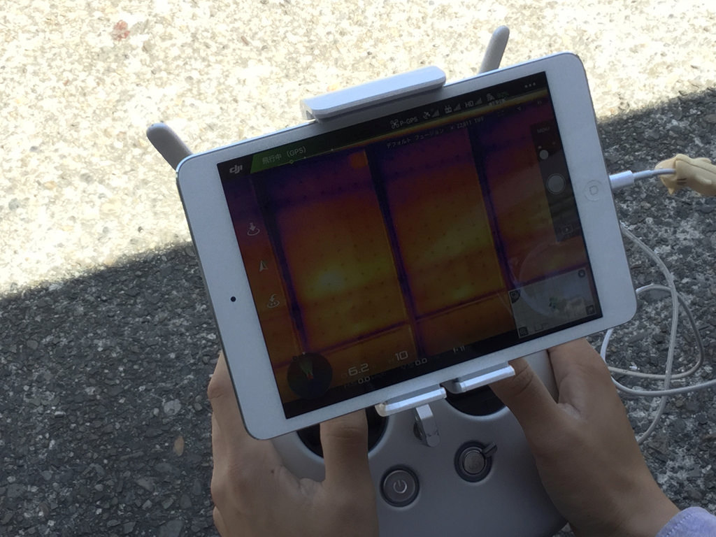 そして本題?太陽光パネルの確認。もう一台のドローンには赤外線カメラが搭載されています。