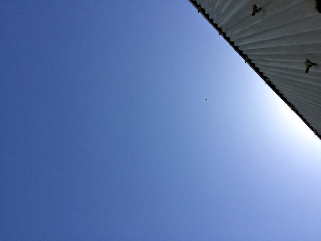 まず1台目のドローンをガレージ通路に置き早速先生が操作を始めると、羽根がしばらく回ったかと思えば、スルスルスル〜と快晴な上空に上がって行きました。あ!、え?、一直線に上昇するドローンはまたたく間に何処にいるのかも分からなってしまいました。ぽか〜んと上を見上げるばかり。すると先生が、上からはこんな感じに見えてますよ。と覗かせてもらったタブレットに映し出された一場面が最初の写真です。とても晴れていたので、街並みがびっくりするほど綺麗に見えます。博物館に展示されている街並み模型をみているような気分。真下に向ければ、めっちゃリアルなグーグルマップ?と思ってしまいそうな鮮明さです。鳥にでもなった気分であちこち見渡せます。なんもかもマル見えやな〜って印象。