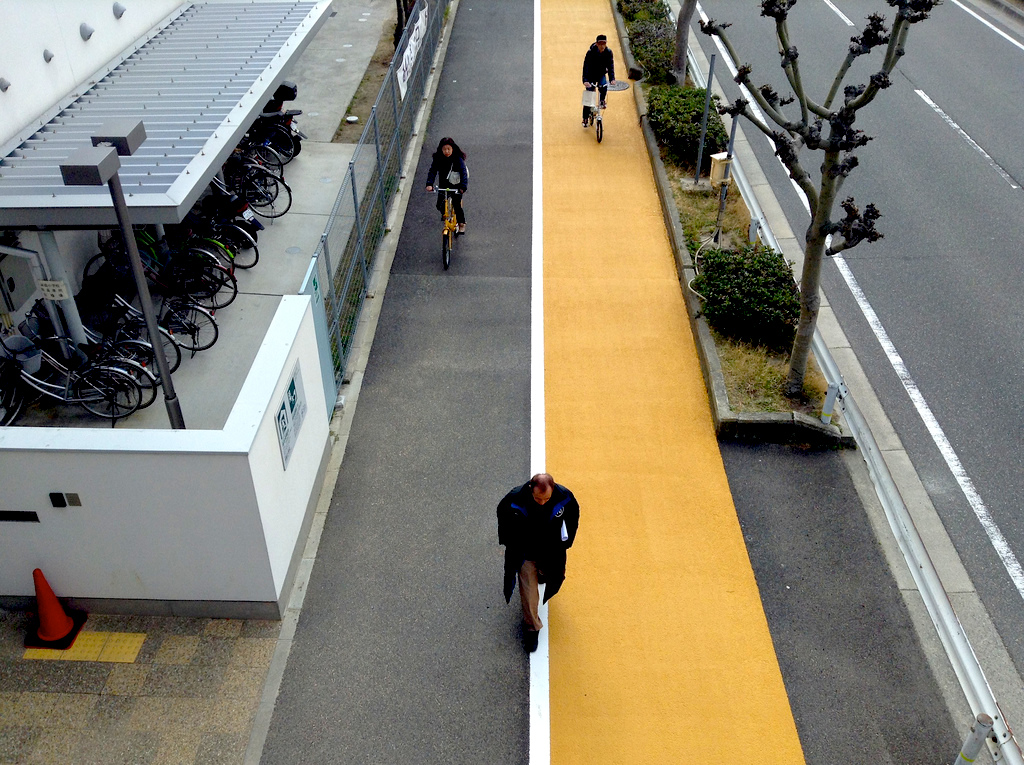 で、こうして色が色分けされた通路になると、なぜか人はまっすぐ進むようになります。ちゃんと歩道部分を歩く人や自転車、そうでない人や自転車、ライン上を平均台さながらの人や自転車。いずれにせよ、右に左にといった不意な感じが少なくなった気がします。暗黙の交通ルールを守る従順な国民性なのか、生まれ持つ心理的な行動なのか、ともかくその変化に気がつくとちょっと面白い気がします。