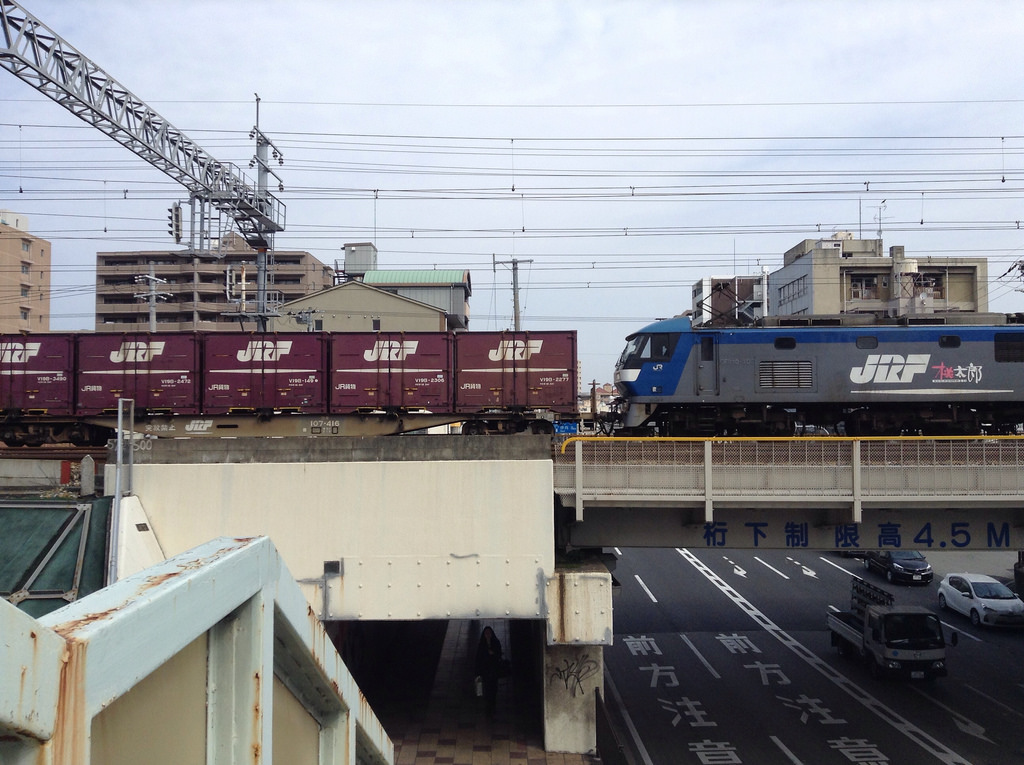 歩道橋を渡っていると、目の前をゆっくりと貨物列車が通り過ぎようとしていました。貨物列車に郷愁のような魅力を感じて、走っている姿につい見入ってしまいます。何を載せて走っているのでしょう。
