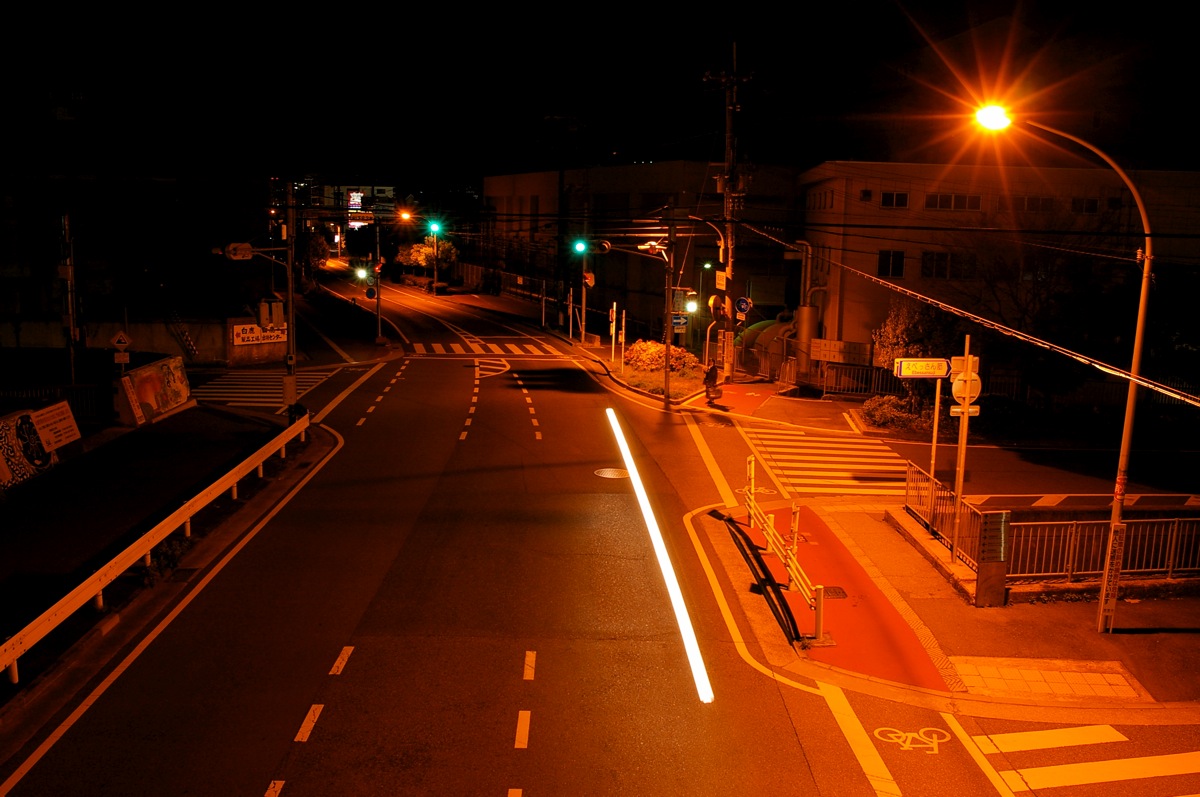 家と事務所の通い道のひとつ、小中学校前の少し幅広い歩道がこの2〜3日の間で自転車通路のカラー舗装がされました。そんな工事があると知らず、帰り道初めて見た時には既に白いラインが街路灯に照らされ延々と入っていました。次の日には山吹色の路面になっていました。急な風景の変化に、え?なに?コレって感じです。